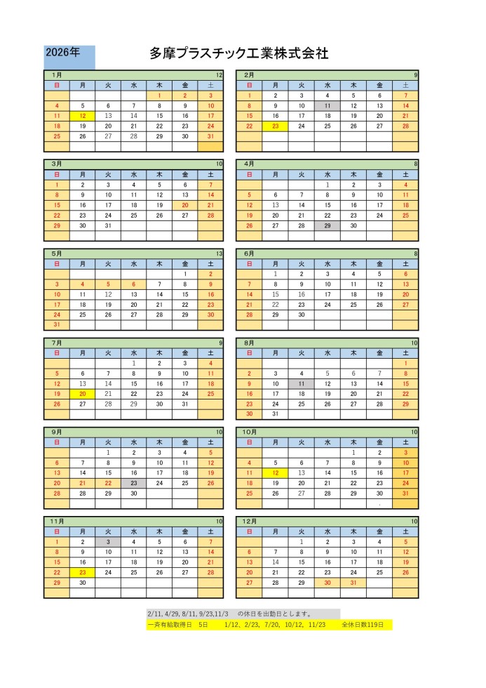 2026年多摩プラスチック工業株式会社 年間カレンダー